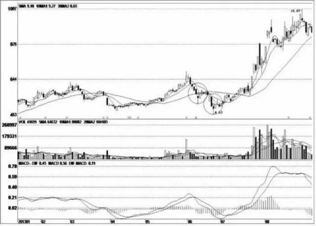投资者在实盘操作中,遇到这种情形时应密切关注前期低点支撑情况,并可以在该位置少量做多,只要不破前期低点就可以大胆持股。或者,在股价走强后成功穿过30日均线时,可以适当地加大持仓量。