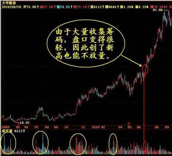 (1)底部由于大量收集筹码,盘口变得很轻,因此创了新高也能不放量。