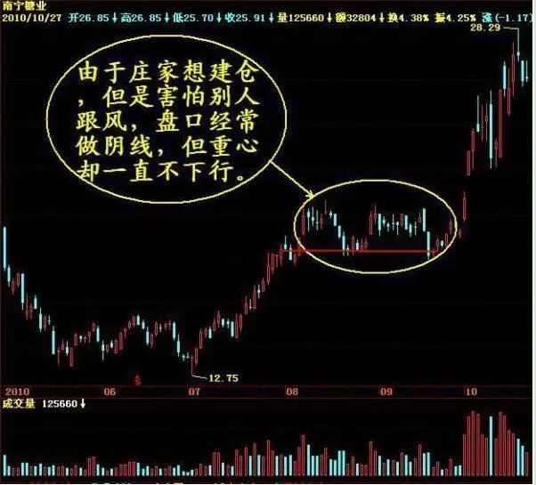 (2)、由于庄家想建仓,但是害怕别人跟风,所以经常做阴线,但是重心却一直上行。