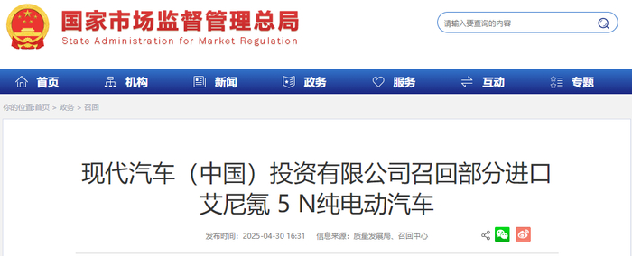 现代汽车(中国)投资有限公司召回部分进口艾尼氪 5 N纯电动汽车