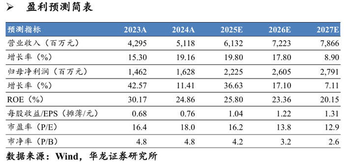 2025年4月25日,公司发布2024年年报及2025年一季报。报告显示,公司2024年营业收入51.18亿元,同比增长19.16%;归母净利润16.28亿元,同比增长11.41%;实现扣非归母净利润15.99亿元,同比增长18.43%。2025Q1,公司实现营业收入13.53亿元,同比增长3.46%;归母净利润5.18亿元,同比增长21.57%;扣非归母净利润5.16亿元,同比增长21.66%。