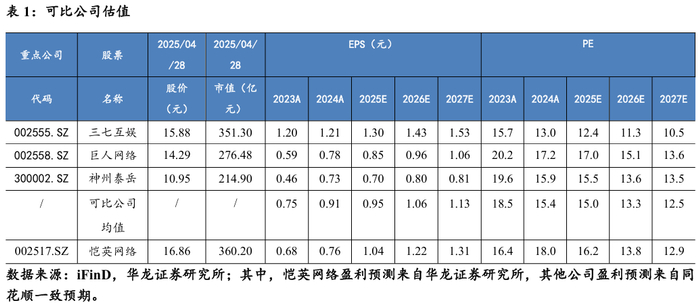 盈利预测及投资评级:公司一季度盈利能力显著提升,产品矩阵丰富,在游戏开发和AI应用领域均有创新突破。我们调整公司2025-2027年收入为61.32亿元/72.23亿元/78.66亿元(原2025年/2026年为59.13亿元/68.80亿元)。归母净利润为22.25亿元/26.05亿元/27.91亿元。(原2025年/2026年为24.26亿元/26.43亿元)。对应公司2025年4月28日股价2025-2027年PE分别为16.2/13.8/12.9倍。参考可比公司三七互娱、巨人网络、神州泰岳,我们看好公司主业的稳健增长和积极布局境外市场带来的增量机会,维持“买入”评级。
