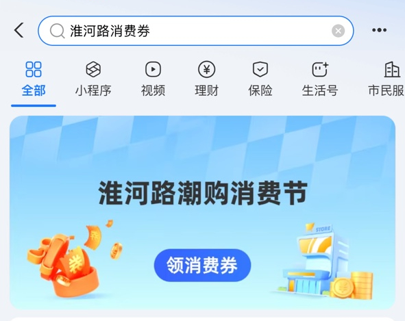 消费者打开支付宝APP,首页搜索“淮河路消费券”,进入“淮河路潮购消费节”活动页面,在规定时间内抢券。活动期间,同一用户每天可在活动页面上的4种面额消费券中最多选择2张领取,先到先得,领完为止。