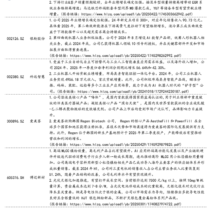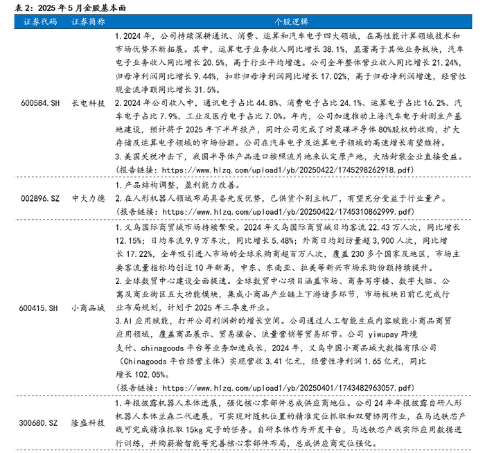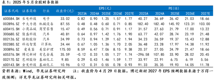 五、2025年5月金股。重点关注金股,长电科技(600584.SH)、中大力德(002896.SZ)、小商品城(600415.SH)、隆盛科技(300680.SZ)、银轮股份(002126.SZ)、科远智慧(002380.SZ)、爱美客(300896.SZ)、博迁新材(605376.SH)、芭田股份(002170.SZ)、金发科技(600143.SH)。