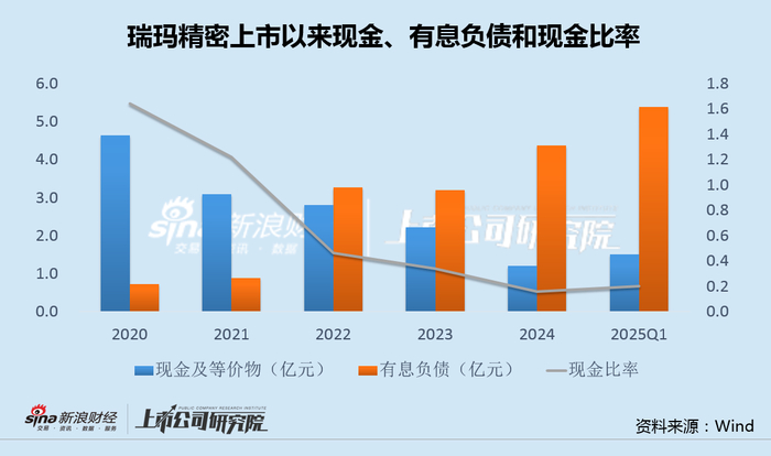 截至2025年一季度末,瑞玛精密账面全部现金及等价物合计仅1.5亿,还不足以覆盖2.2亿的短期借款,更远低于同期5.4亿的有息负债。此番斥资近2亿收购后,无疑再度加剧资金压力。