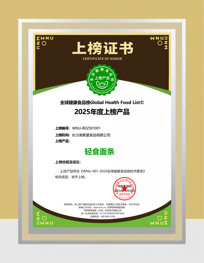 零零优轻食面条荣获全球健康食品榜上榜产品
