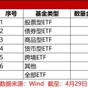 分基金类型梳理,股票型ETF是“主力军”。Wind数据显示,截至4月29日,股票型ETF共有922只,占据全市场ETF的八成,规模高达2.94万亿元,占比72.73%;跨境ETF数量有145只,规模为5209.22亿元,占比12.87%;债券型ETF共有29只,规模为2416.62亿元,占比5.97%;货币型ETF有27只,规模为1714.68亿元,占比4.24%;商品型ETF有17只,规模为1635.17亿元,占比4.04%。