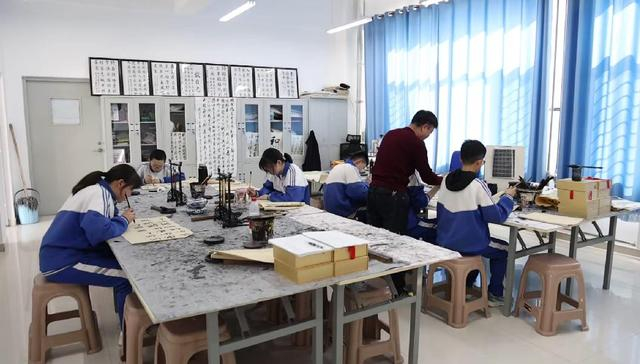 学生们正悬腕运笔临摹书法。