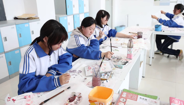 学生们手持画笔凝神创作。