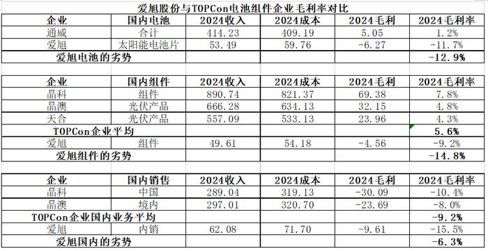 三、爱旭股份毛利率与TOPCon电池组件企业毛利率的对比