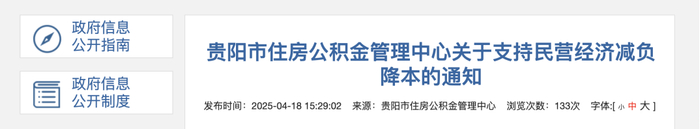 2025年4月18日,贵阳市住房公积金管理中心发布《贵阳市住房公积金管理中心关于支持民营经济减负降本的通知》,明确自5月1日起,生产经营困难的民营企业可申请调整住房公积金缴存比例。