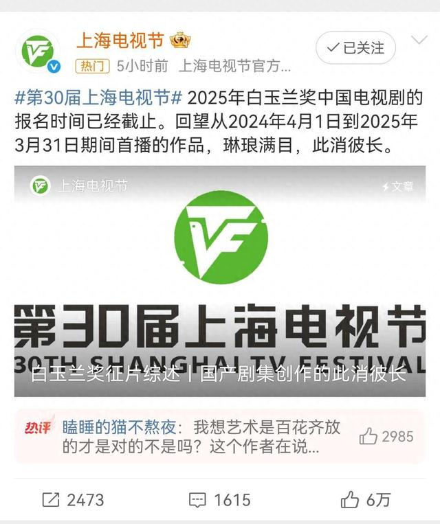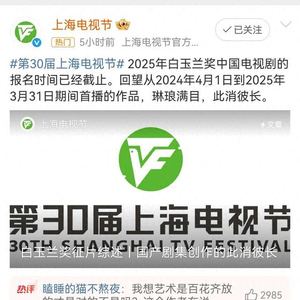 第30届上海电视节征片自去年12月上旬开启,至今年3月31日结束,征集到作品近千部。每届上海电视节的白玉兰奖评选荟萃前一年四月份起,到当年一季度的广播电视和网络视听精品力作,折射行业风貌。入围名单将于五月发布。
