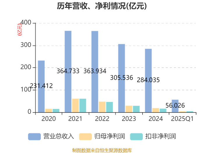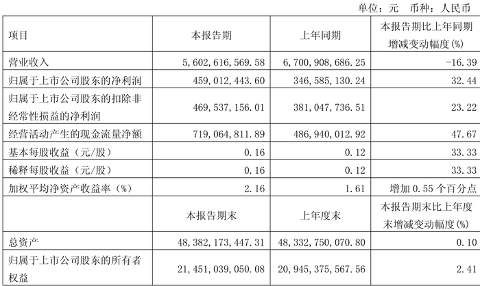 中证智能财讯鄂尔多斯(600295)4月30日披露2025年第一季度报告。公司实现营业总收入56.03亿元,同比下降16.39%;归母净利润4.59亿元,同比增长32.44%;扣非净利润4.7亿元,同比增长23.22%;经营活动产生的现金流量净额为7.19亿元,同比增长47.67%;报告期内,鄂尔多斯基本每股收益为0.16元,加权平均净资产收益率为2.16%。