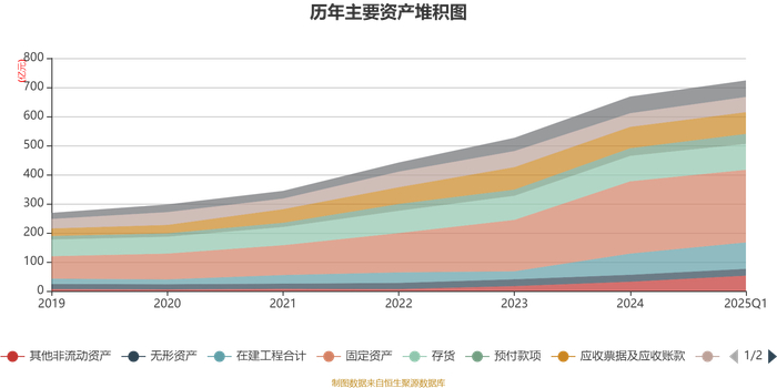 资产重大变化方面,截至2025年一季度末,公司固定资产较上年末增加0.5%,占公司总资产比重下降2.67个百分点;其他非流动资产较上年末增加65.45%,占公司总资产比重上升2.5个百分点;在建工程合计较上年末增加24.81%,占公司总资产比重上升1.66个百分点;存货较上年末增加1.44%,占公司总资产比重下降0.83个百分点。