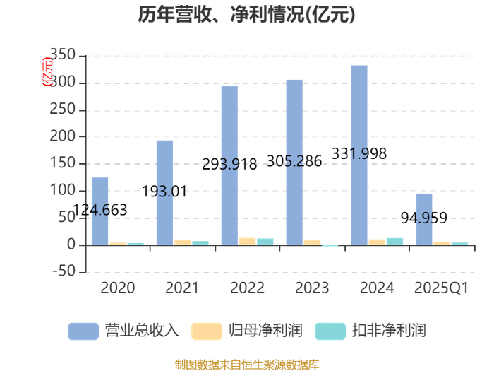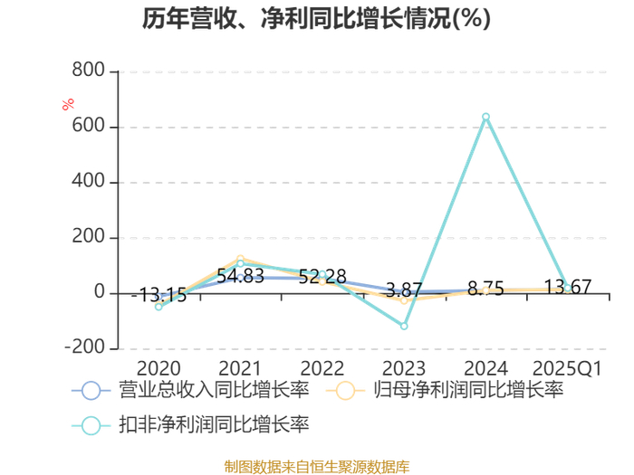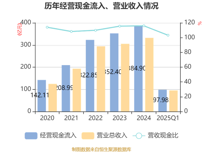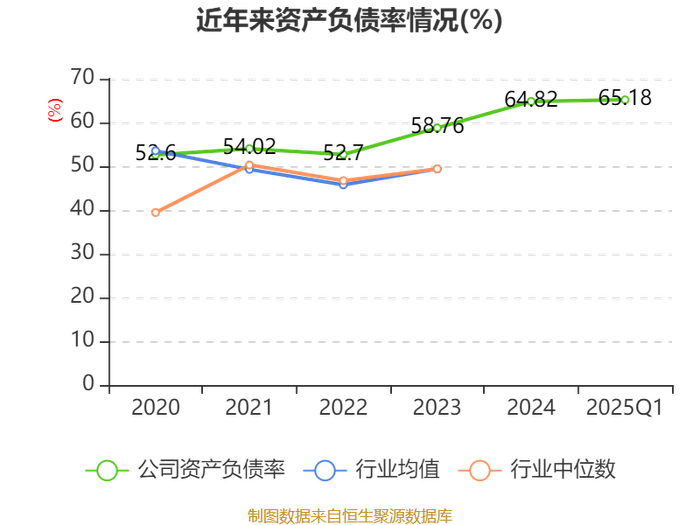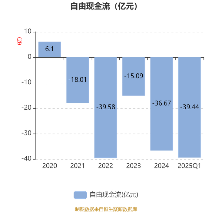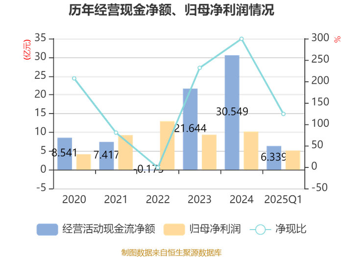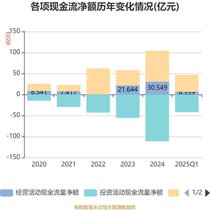 截至2025年一季度末,公司经营活动现金流净额为6.34亿元,同比增长77.92%;筹资活动现金流净额40.42亿元,同比增加22.99亿元;投资活动现金流净额-42.06亿元,上年同期为-26.6亿元。