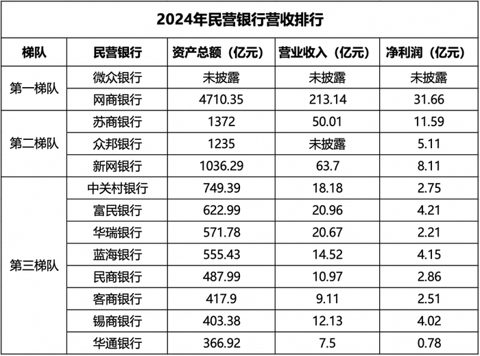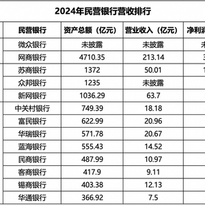 第二梯队的苏商银行、众邦银行成为中小民营银行增长标杆。其中苏商银行2024年总资产1372亿元,营收超50亿,净利润11.59亿元,同比增长10.34%;众邦银行2024年净利润5.11亿元,同比增长26%,资产规模达1235亿元。