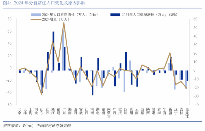 人口的机械增长对地区人口总量的影响更加重要。31个省份中有18个省份2024年人口处于净流出状态,13个省份2024年人口处于净流入。净流出的省份中河南、山东、云南人口净流出的规模居于前三,分别流出29万人、25.9万人、18.8万人。其中云南人口自然增长为正值,但由于人口净流出,使得全年常住人口同比减少。区域视角看,东部地区仍然是人口净流入较多的地区,但东部部分省份如山东、河北人口也出现净流出。东北三省人口则全部处于净流出状态。中西部省份尽管大部分省份人口净流出,但安徽、湖北、重庆、四川、新疆等地人口却呈现出规模较大的净流入。