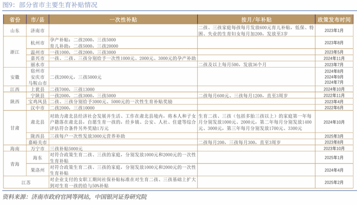 一是出台更加积极和系统化的一揽子鼓励生育政策以应对出生率下降的严重挑战,如建立生育补贴制度。2024年10月国务院印发《关于加快完善生育支持政策体系推动建设生育友好型社会的若干措施》的通知,强调要建立生育补贴等制度。我国目前已有二十多个省市实施了不同程度的生育补贴措施。但补贴的力度尚存进一步提升空间。近期以内蒙古呼和浩特为代表的生育补贴政策在补贴力度方面明显提升。4月28日召开的国务院新闻发布会上,国家发改委副主任赵辰昕也表示将建立实施育儿补贴制度,预计后续全国层面的生育补贴政策有望加快落地。