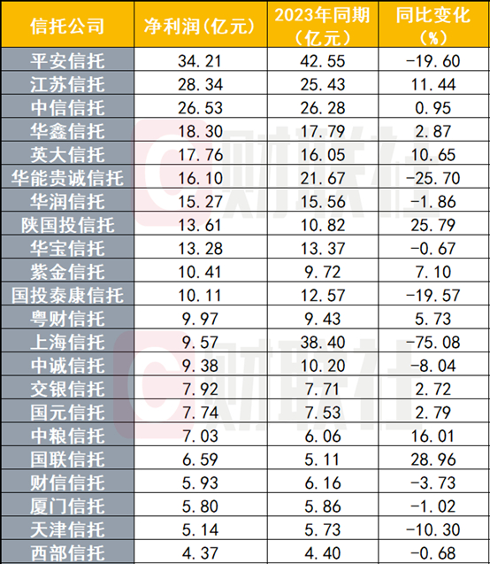 随着信托转型持续,整体业绩分化明显,多达5家信托公司2024年净利润跌幅超100%,分别是浙金信托、五矿信托、重庆信托、兴业信托和昆仑信托。