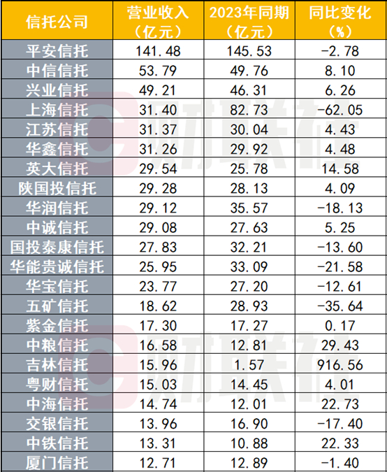 从43家信托公司营收增幅比例来看,吉林信托、昆仑信托、华宸信托同比涨幅均超100%,其中吉林信托营收同比涨916.56%。