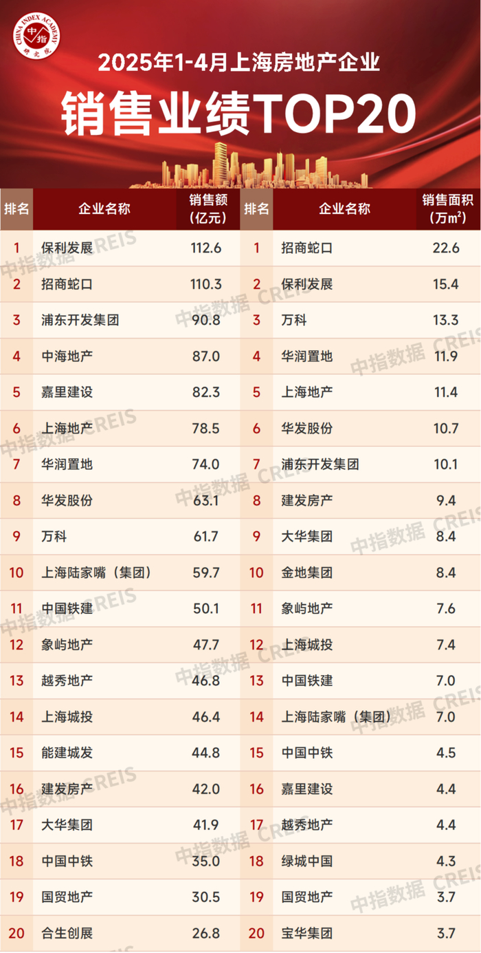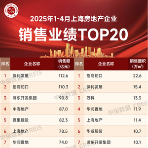 2025年1-4月,上海房地产销售业绩TOP20企业合计销售1231.8亿元;销售面积TOP20企业合计销售175.5万平。销售额突破70亿元的房企有7家,其中保利发展、招商蛇口、浦东开发集团分别以112.6亿元、110.3亿元和90.8亿元获得销售金额榜前三名;销售面积榜达到10万平以上的房企有7家,招商蛇口、保利发展、万科分别以22.6万平、15.4万平和13.3万平获得前三名。