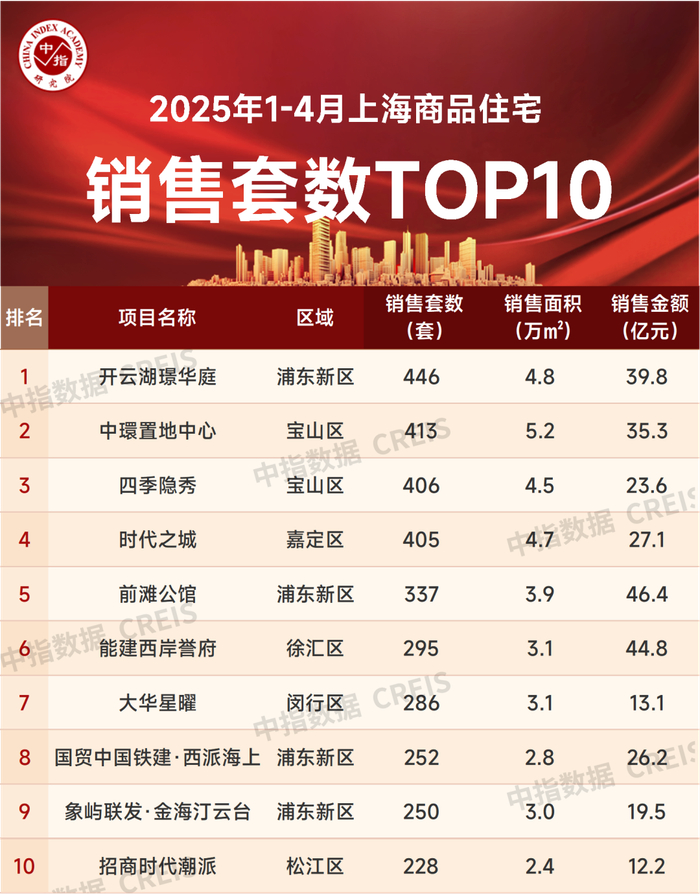 2025年1-4月,上海商品住宅销售套数TOP10项目合计销售3318套。其中,开云湖璟华庭以446套占据项目销售套数榜单的第一名,中環置地中心、四季隐秀分别以413套、406套位列项目销售套数榜单的第二、第三名。