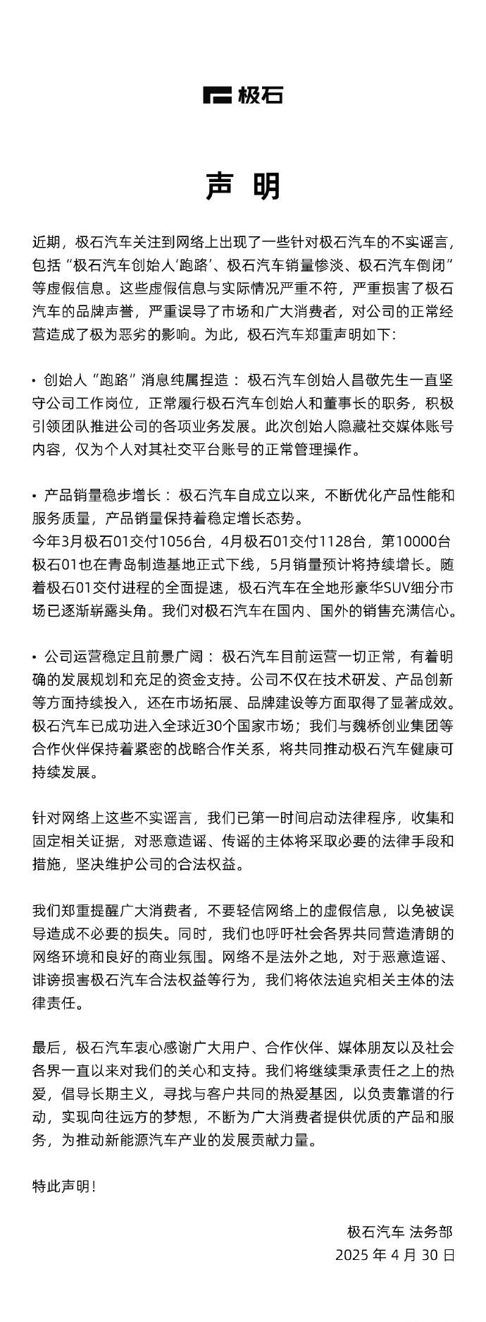 4月30日,极石汽车法务部发布声明称,近期关注到网络上出现了一些针对极石汽车的不实谣言,包括“极石汽车创始人‘跑路’、极石汽车销量惨淡、极石汽车倒闭”等虚假信息。