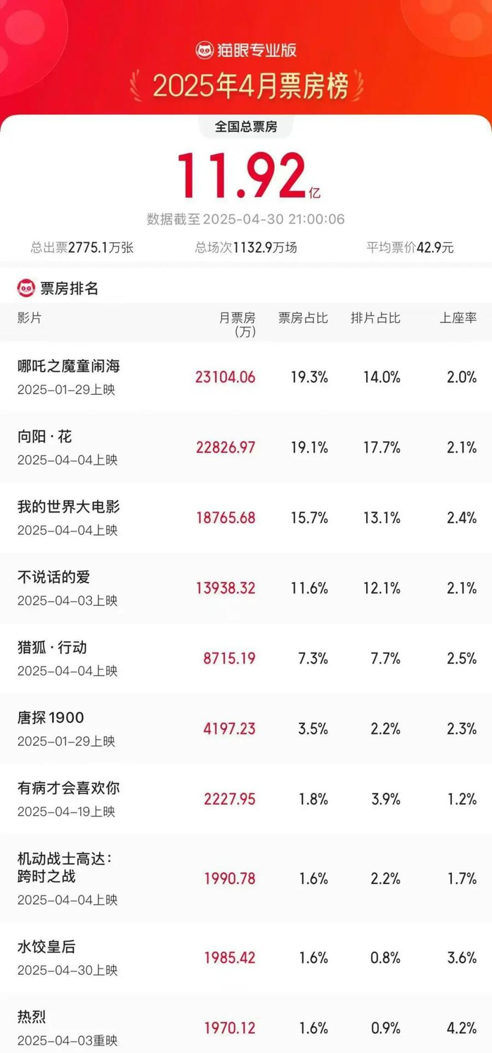 4月全国电影总票房11.92亿 《哪吒2》再登月票房冠军