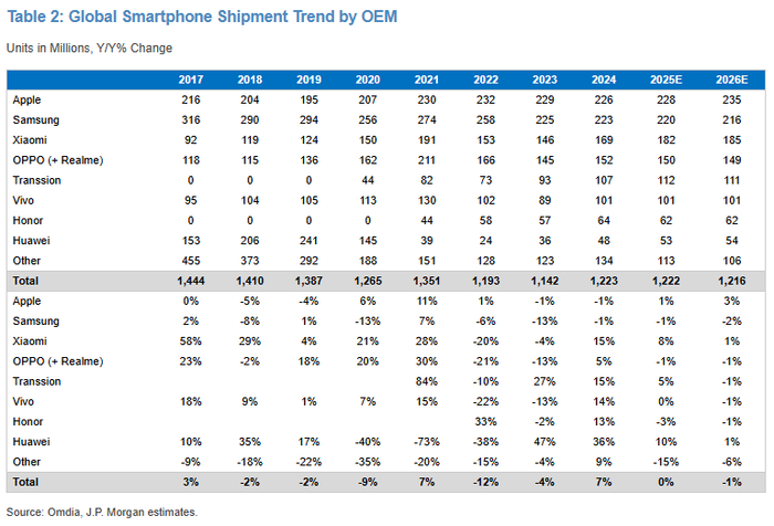 摩根大通指出,全球智能手机出货量预计2025年持平,2026年下降1%。尽管中国补贴政策与换机周期延长原本有望带动温和增长,但宏观疲弱正在压制消费动能,尤其在北美市场因关税传导导致连续两年下滑。短期内,OEM及消费者因规避涨价而提前拉货,支撑2025年上半年,但将导致下半年同比转弱。