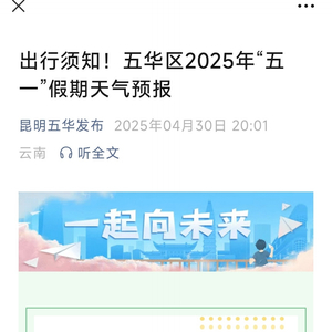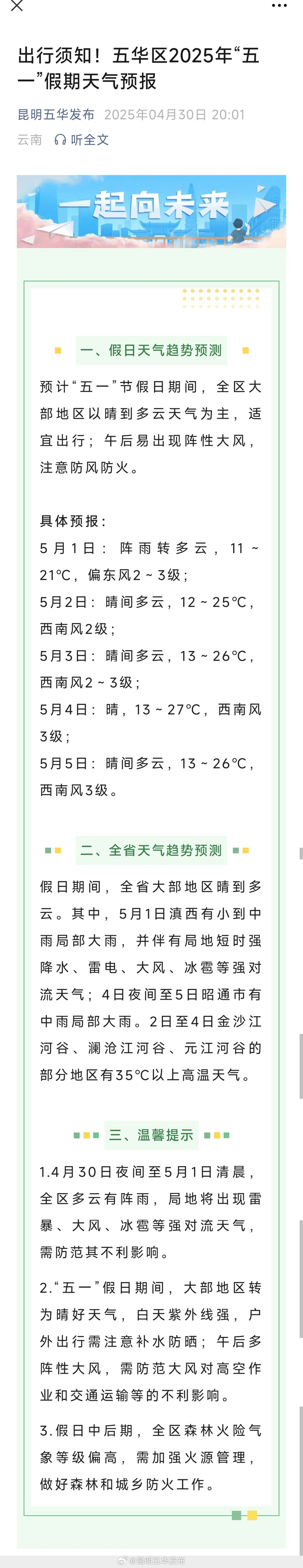 出行须知!五华区2025年“五一”假期天气预报 昆明信息港 昆明信息港官方账号 2025.04.3021:09 关注 预计“五一”节假日期间,全区大部地区以晴到多云天气为主,适宜出行;午后易出现阵性大风,注意防风防火。出行须知!五华区2025年“五一”假期天气预报