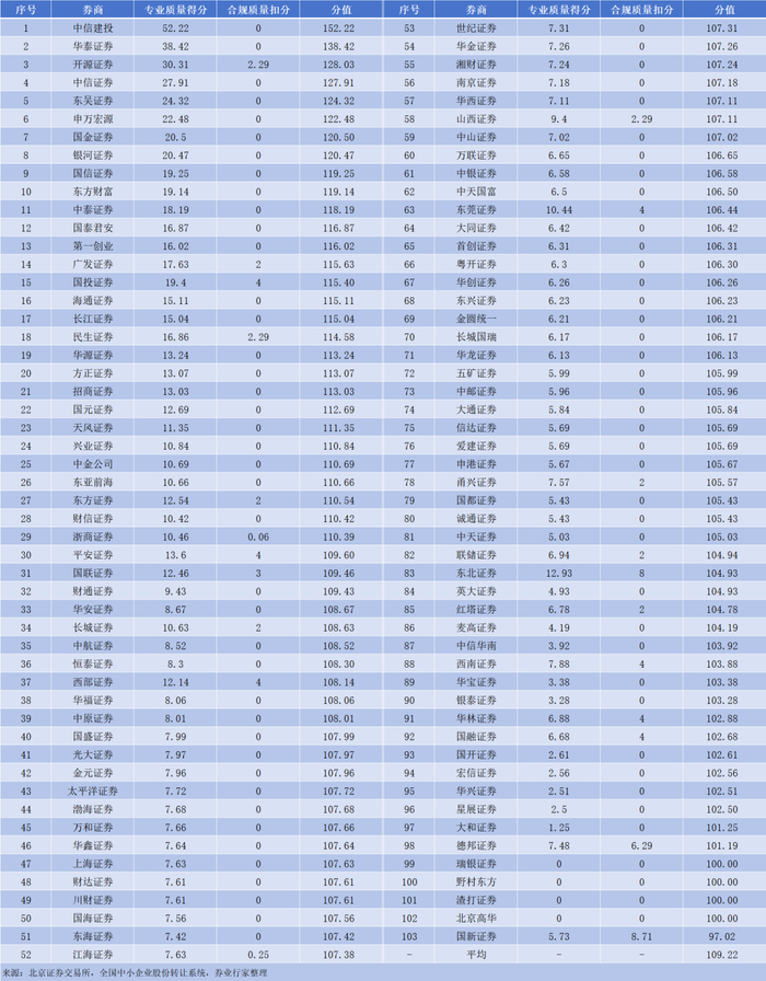 本次共有114家券商(合并后103家券商)参评,平均分值为109.22,较2024年度分值有所下降。分值中位数为107.38,52家券商集中在105-110分段。详细排名如下: