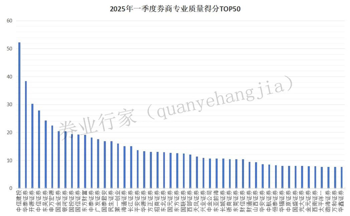 专业质量得分TOP10分别是:中信建投(52.22)、华泰证券(38.42)、开源证券(30.31)、中信证券(27.91)、东吴证券(24.32)、申万宏源(22.48)、国金证券(20.5)、银河证券(20.47)、国投证券(19.4)和国信证券(19.25),其中前八位与执业质量评价位次全同。
