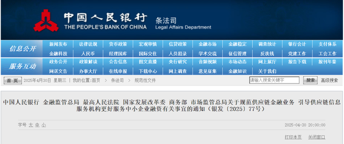 2025年4月30日,中国人民银行 金融监管总局 最高人民法院 国家发展改革委 商务部 市场监管总局关于规范供应链金融业务引导供应链信息服务机构更好服务中小企业融资有关事宜的通知(银发〔2025〕77号),鼓励发展多样化的供应链金融模式。鼓励商业银行加强自身能力建设,更多采取直接服务方式触达供应链企业,提升应收账款融资服务质效,积极探索供应链脱核模式,利用供应链“数据信用”和“物的信用”,支持供应链企业尤其是中小企业开展信用贷款及基于订单、存货、仓单等动产和权利的质押融资业务。鼓励商业银行完善供应链票据业务管理制度、优化业务流程和系统功能,推动供应链票据扩大应用。研究推动经营主体在平等自愿的前提下,通过市场化、法治化方式试点供应链票据有限追索服务。引导金融机构在依法合规、风险可控的前提下,有序开展供应链票据资产证券化试点,拓宽票据融资渠道。