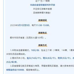 据“衢州发布”消息,5月1日到5日,衢州市政府食堂每日11时30分到13时提供中餐。主打“鲜辣衢州”风味,推出18元每份的标准套餐,含一荤一素一半荤半素菜。此外还有兔头、鸭头、鸭掌等风味小吃。因食堂餐位数及承载能力有限,用餐前需购买餐券,每餐限量供应1500份,餐券售完即止。