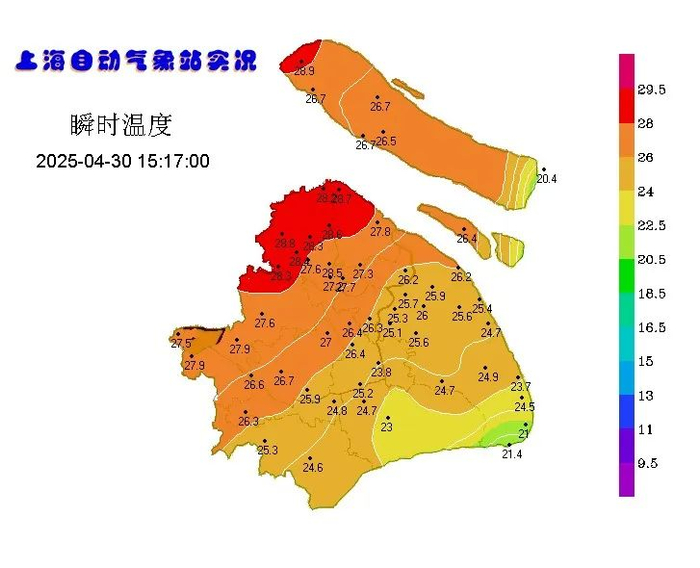 四月的最后一天,太阳当空照,气温节节高。早间全市最低气温大多在16~18度附近,崇明14度为最低。白天最高气温西北部较高,超过29度,市区徐家汇站定格在28.2度。午后云系增多,随着高空槽东移,今天下半夜起短时阵雨就要来“打卡”了。