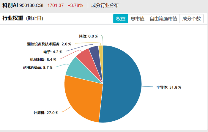上证科创板人工智能指数:重点关注半导体行业,半导体行业权重超过50%,还涉及计算机、耐用消费品、机械制造、电子等行业。
