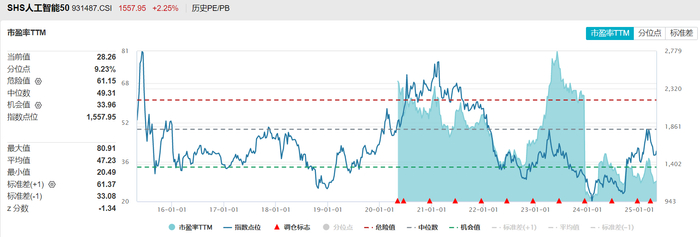 中证沪港深人工智能50指数目前的市盈率TTM还在历史10%分位以下,属于很低的水平。