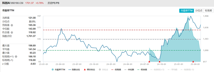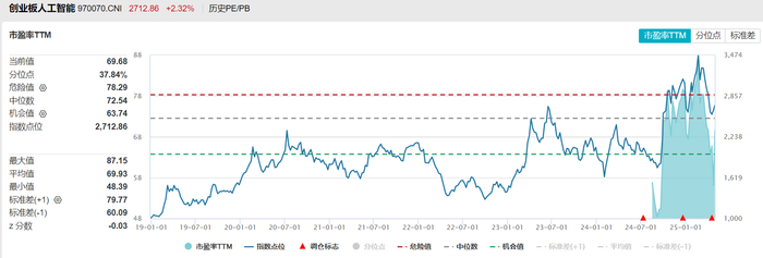 上证科创板人工智能指数目前的市盈率TTM在历史30%分位以下,属于较低的位置,不过需要注意的是,过往可参考的时间较短,数据还未形成长期的参考价值。