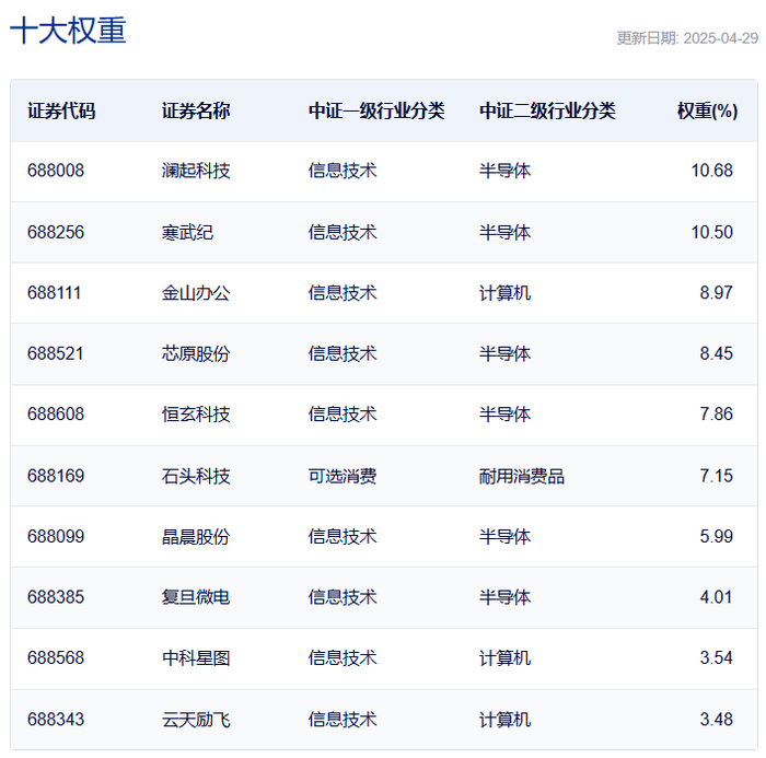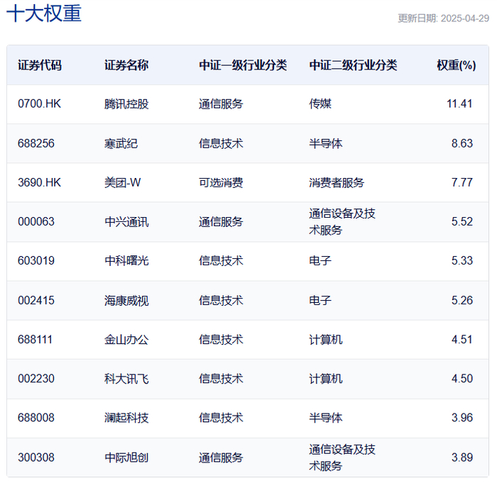 中证人工智能主题指数:前十大权重股包括寒武纪、韦尔股份、海康威视等,合计占比超过50%,涉及半导体和通信设备的股票数量较多。