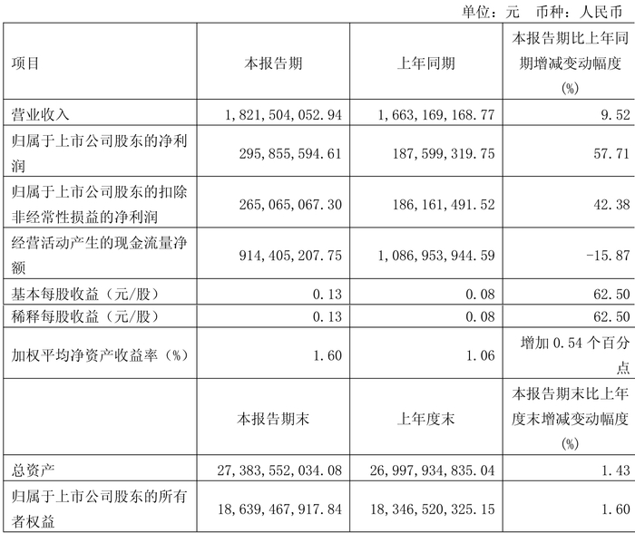中证智能财讯白云机场(600004)4月30日披露2025年第一季度报告。公司实现营业总收入18.22亿元,同比增长9.52%;归母净利润2.96亿元,同比增长57.71%;扣非净利润2.65亿元,同比增长42.38%;经营活动产生的现金流量净额为9.14亿元,同比下降15.87%;报告期内,白云机场基本每股收益为0.13元,加权平均净资产收益率为1.60%。