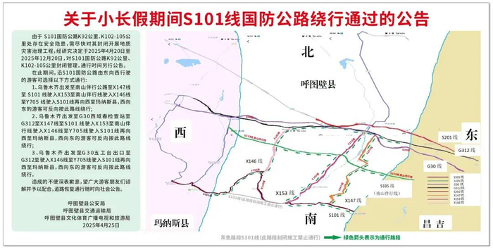 由于S101国防公路K92公里、K102-105公里处存在安全隐患,需尽快对其封闭开展地质灾害治理工程,经研究决定于2025年4月20日至2025年12月20日,对S101国防公路K92公里、K102-105公里封闭管理,通行时间另行公告。