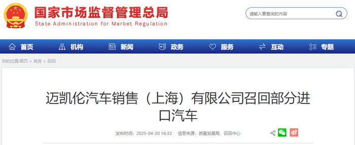 迈凯伦汽车销售(上海)有限公司召回部分进口汽车