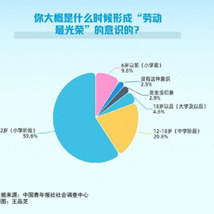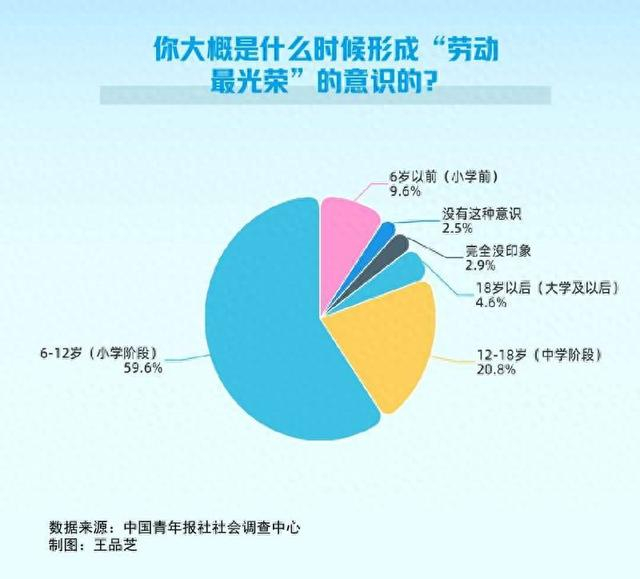 调查显示,82.2%的受访者认同“劳动最光荣”。大家是什么时候形成“劳动最光荣”的意识的?59.6%的受访者表示是在6-12岁,20.8%的受访者是在12-18岁,9.6%的受访者是在6岁以前,4.6%的受访者是在18岁以后。