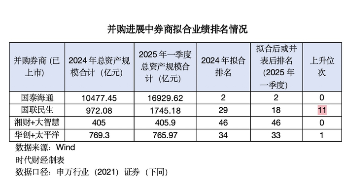 时代财经据2024年报及2025年一季报数据,以资产规模统计,国泰海通目前已跻身行业第2,国联民生跻身第18。不过,也有不少处于并购进展中的中小券商,即便在完成合并后,资产规模排名也未有大的提升。