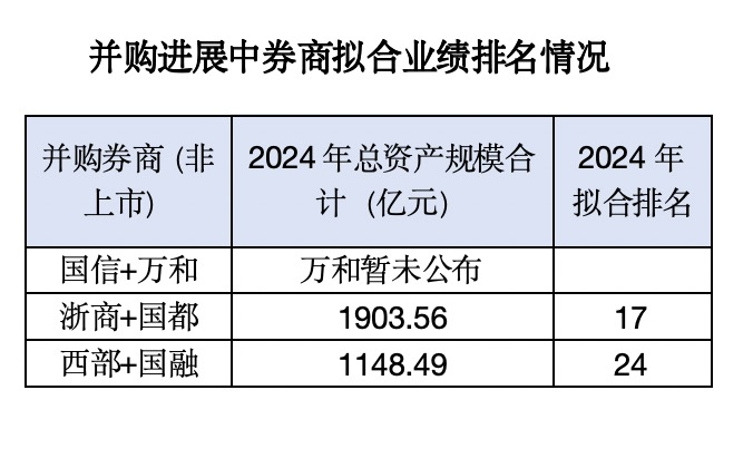 国信证券是并购进展券商中较为突出的存在,作为头部券商,这次整合选择资产规模很小的万和证券。国信证券2024年末总资产为5015.06亿元,位列第10位,而万和证券公布的2024年的年度财务报告中指出,2024 年公司总资产行业排名87名,但并未公布具体规模数据。