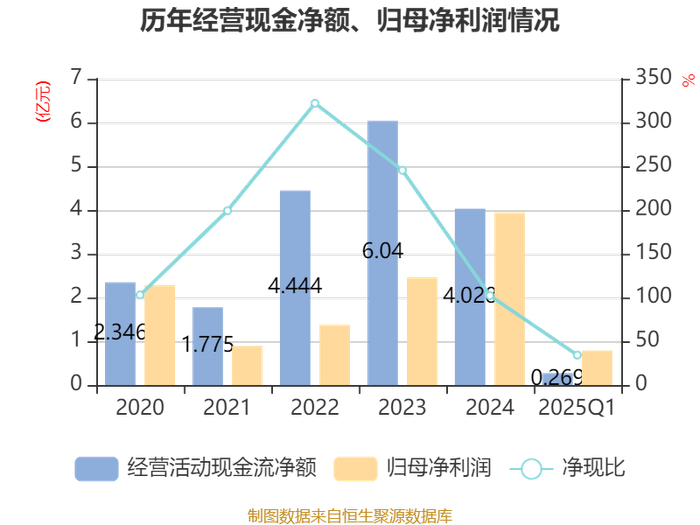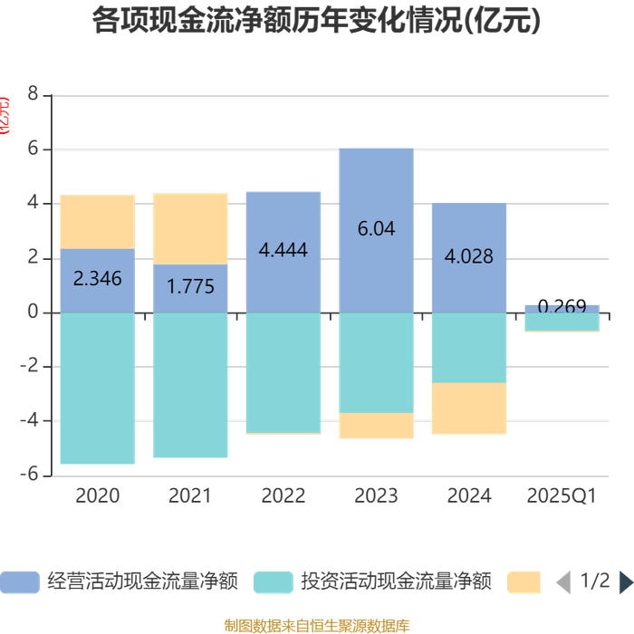 截至2025年一季度末,公司经营活动现金流净额为2687.12万元,同比下降83.5%;筹资活动现金流净额-400.34万元,同比增加5439.21万元;投资活动现金流净额-6800.23万元,上年同期为-9453.7万元。