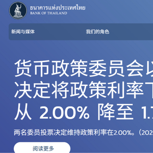 泰国央行货币政策委员会以5票赞成、2票反对的结果决定将隔夜回购利率下调25个基点至1.75%,为两年来的最低水平。这一决定延续了2月份会议上同样的降息幅度。
