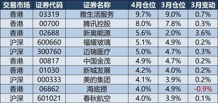 4月主要增持:新奥能源、环球医疗、杭州银行、港股红利指数ETF。