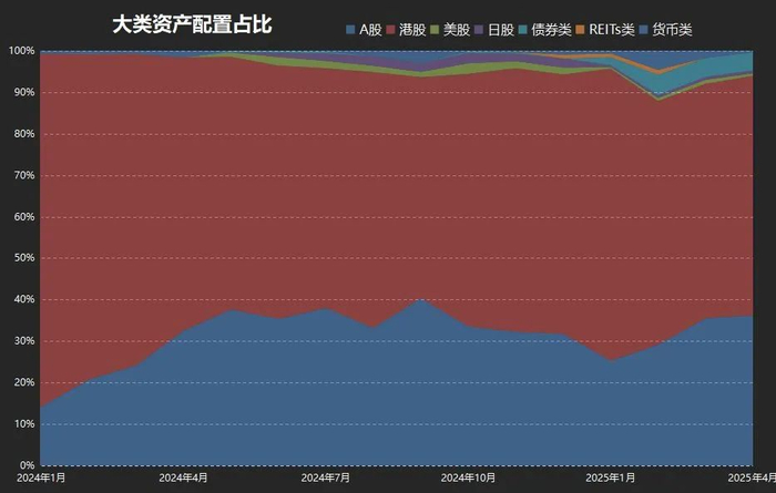 A股持仓36.2%↗,港股57.7%↗,美股0.6%↘,日股0.7%→。