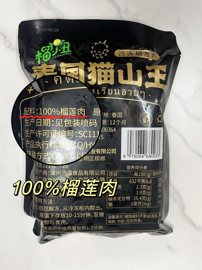 背面的配料表上干干净净,只有榴莲肉(含核)。
